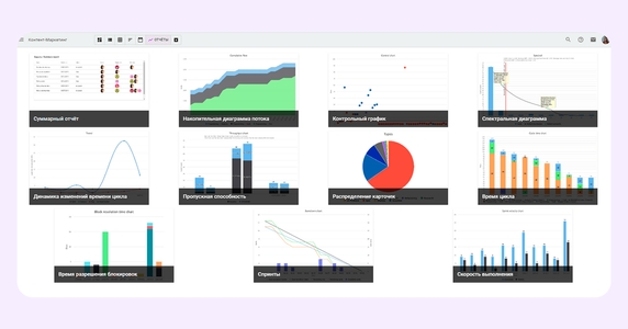 Так как все задачи и процесс работы визуализированы, вы сможете анализировать эффективность команды и замечать, если она сталкивается с проблемами. В этом вам помогут встроенные графики и отчеты в Kaiten.
