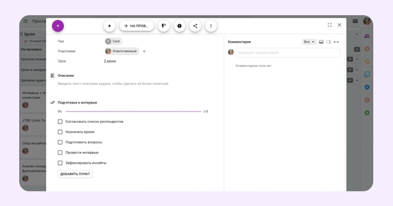 Если задача объемная, создайте чек-лист с более мелкими задачами. Например, в карточке «Интервью с пользователями» может быть такой чек-лист:
