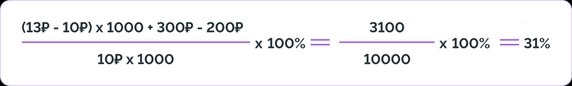 Например, инвестор купил 1000 акций по цене 10 ₽ за штуку, а позже продал их по 13 ₽. При этом он получил 300 ₽ дивидендов, а на оплату комиссий при совершении сделок потратил 200 ₽.