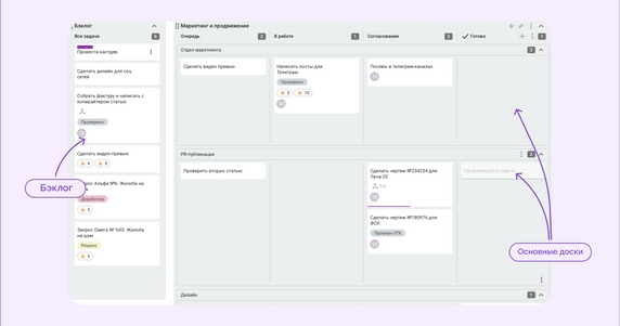 В Kaiten можно создать несколько досок в одном рабочем пространстве для разных типов данных. Например, используйте одну доску для идей по развитию продукта, а другую — для текущей работы, ожидающей выполнения.