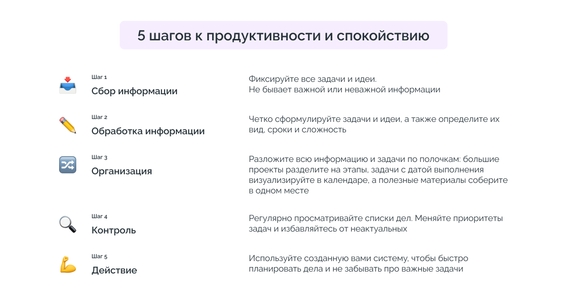 Метод GTD включает пять этапов работы с задачами и информацией, которые помогают организовать мысли, структурировать дела и сосредоточиться на их выполнении.