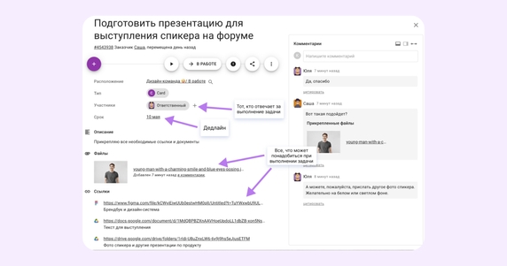 Внутри карточки вы также можете общаться с коллегами. Другие сотрудники могут оставлять правки к задаче прямо в таск-трекере, чтобы исполнителю не нужно было при выполнении задания по кусочкам собирать информацию из разных каналов коммуникаций.
