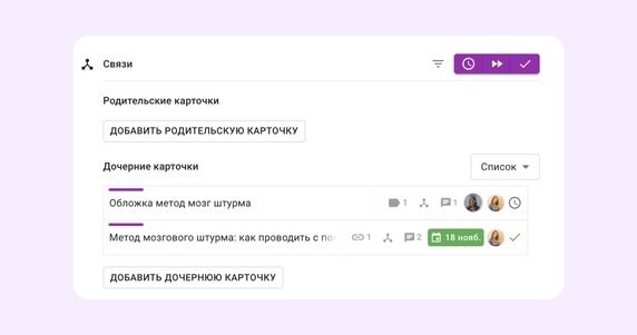 Также дочерние карточки помогают декомпозировать крупную задачу на более простые и понятные этапы.