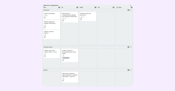 Основа GTD — визуализация дел и их контекста. Это позволяет вам и вашим коллегам видеть текущие задачи и реальную нагрузку в любой момент времени, избегать перенапряжения и выявлять, какие процессы можно улучшить.
