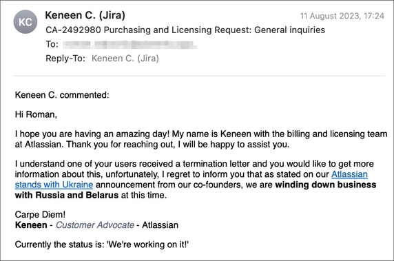 Все началось как у всех: несколько месяцев назад Роман получил от Atlassian письмо о том, что через 30 дней доступ к аккаунту компании будет закрыт.