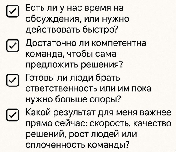 Ответы на эти вопросы помогут определить, стоит ли действовать директивно, проводить коллективное обсуждение, развивать сотрудников через вопросы или комбинировать подходы в зависимости от ситуации.