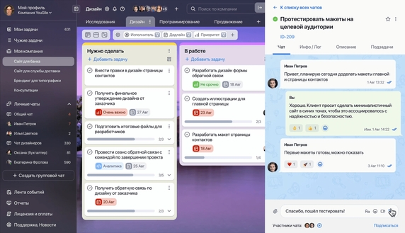 - Каждая задача — это чат, где можно общаться по задаче. Есть функция закрепления сообщений, голосования и уведомлений. Также можно присылать видеосообщения с демонстрацией экрана;