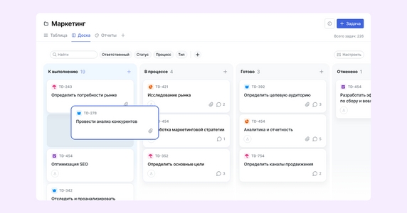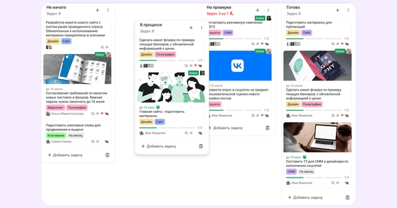 - Размещать карточки с задачами и перетаскивать их между колонками канбан-доски;
