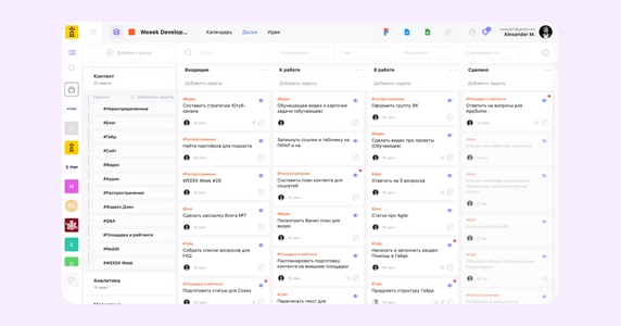 - Канбан-доски, список и календарь. Задачи отображаются в виде визуальных стикеров, которые удобно перетаскивать между колонками. Есть возможность переключаться между канбан-доской, таблицей и календарем;
