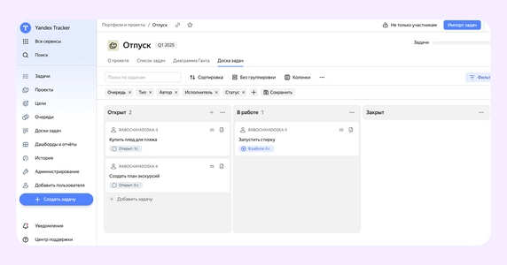 YouGile — российский аналог Trello. Простая доска задач для сотрудников, где основной акцент на визуальное управление проектами.