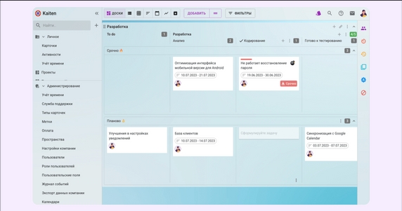 Kaiten — российский сервис для управления проектами, задачами и командами. На рынке с 2018 года, и его используют более чем 100 000 компаний (Сбер, S7 Airlines, X5 Group и др.). В основе работы сервиса — классический канбан: карточки, колонки, метки, но поверх этого — иерархия задач, чек-листы в карточках, вложения и комментарии, база знаний, расширенные отчеты.
