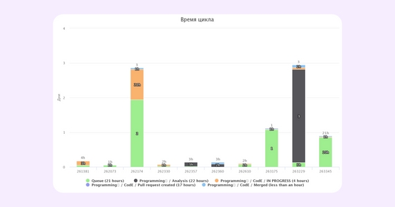 А время цикла отображает сколько времени задача провела на каждом этапе. Например, из графика ниже следует, что в среднем каждая задача проводит 21 час в очереди, в то время как для ее решения требуется всего 4.