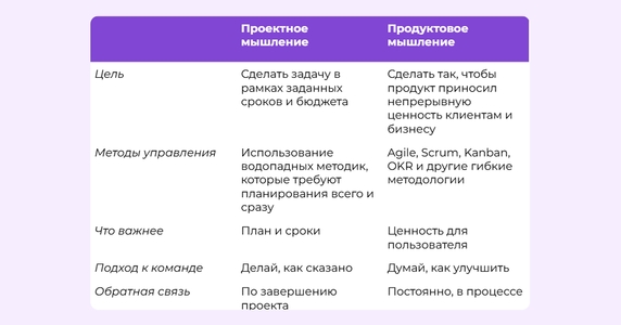 В основе продуктового мышления — понимание, что продукт живет дольше любого проекта и должен адаптироваться под новые условия и потребности. Фокус меняется с «успеть сдать проект в срок» на «рост через продукт и новую культуру работы с командой».