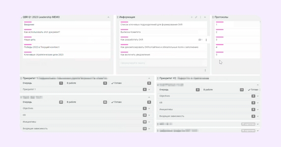 Дальше есть 4 доски для 4 приоритетов компании. Карточки на этих досках — глобальные цели компании, за которые отвечают разные трайбы (кроссфункциональные команды). Это родительские карточки для всех OKR команд.
