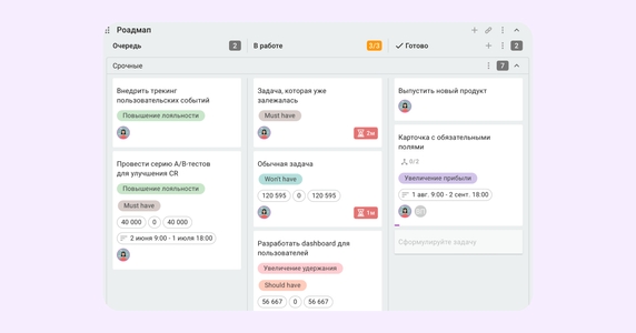 - WIP-лимиты (ограничение количества задач в работе) защищают команду от перегрузки. Руководителю даже не нужно вручную проверять цифры: система сама подсказывает, что пора довести начатые задачи до конца.
