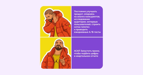 Дано: банк Х выпускает кейс о том, что раздел «Отели» в приложении собирает конверсию 50%. Руководители банка Y отправляют статью в чаты с текстом: «Нам тоже такое надо». Отдел маркетинга принимает задачу и запускает работу: прописывает стратегию, согласовывает бюджеты, находит подрядчиков для разработки. И вот уже через 3 месяца «Отели» появляются в меню приложения банка Y. Только ожидаемой выручки руководители не получили, а вот недовольных клиентов стало больше.