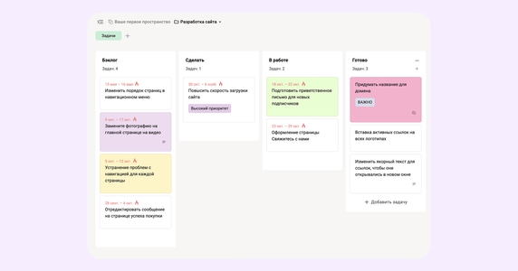 - Фокус на результате — доска показывает движение задач к завершению, что помогает команде не терять цель.