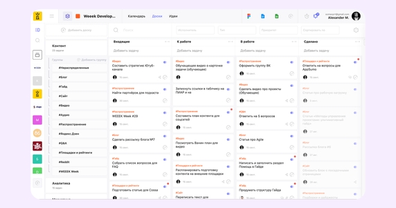 WEEEK — универсальная онлайн-платформа для организации личной и совместной работы. В ней объединены таск-менеджер, канбан-доски, база знаний и CRM-система. Главное отличие сервиса — акцент на недельное планирование: инструмент помогает распределять приоритеты и доводить начатое до результата.