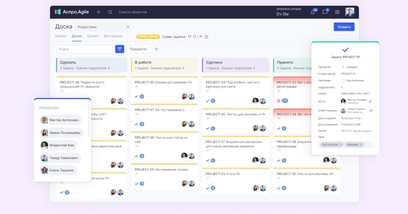 Aspro.Agile — инструмент для организации проектной работы, построенный на принципах Agile-методологий. Основой платформы служат SCRUM-доски, где команда может вести учет задач, распределять приоритеты и отслеживать результативность спринтов.