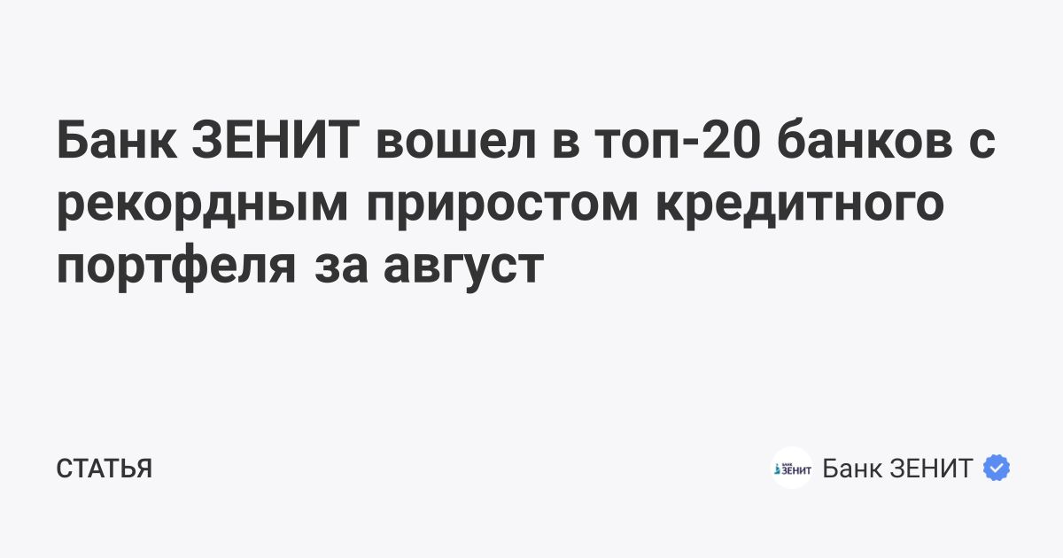 Банк ЗЕНИТ вошел в топ-20 банков с рекордным приростом кредитного портфеля за август