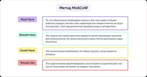 Например, свою эффективность неоднократно показывал подход MoSCoW. Название — акроним четырех категорий требований: Must Have, Should Have, Could Have, Won’t Have. Суть метода — определить каждое требование: