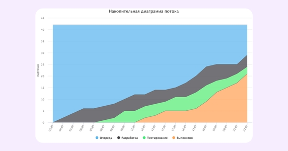 Кроме календарного планирования, полезны канбан-метрики. Например, диаграмма потоков (CFD) в Kaiten показывает баланс входящих и выполненных задач — по ней можно понять, не накапливается ли незакрытая работа.