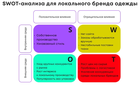 → Про SWOT-анализ у нас есть отдельная статья. Там мы рассказали, как проводить его комплексно, и привели несколько примеров для разных ниш.