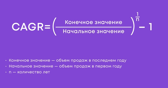 Динамика (CAGR, Compound Annual Growth Rate) — это средний годовой темп роста продаж. Он показывает, на сколько процентов в год меняется объем продаж, и помогает понять, куда движется рынок: вверх или вниз.