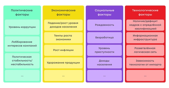 Анализ по этому методу напрямую не касается продукта или команды. Вместо этого маркетологи смотрят на то, что происходит вокруг. Для этого весь рынок разбирают на 4 группы факторов: