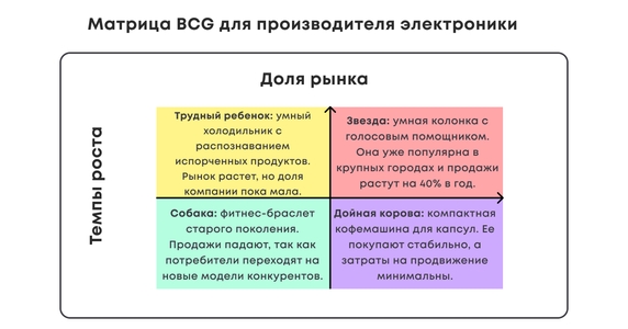 Больше всего матрица подходит для бизнеса, который продает разные группы товаров. Допустим, компания производит электронику для дома. Как может выглядеть матрица:
