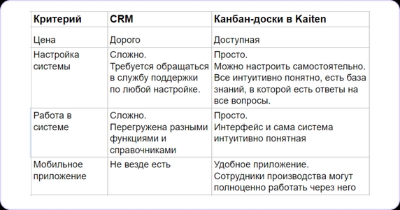 Изучила, какие сервисы с Kanban-методом сейчас есть на рынке, и нашла Kaiten. Сначала попробовала его сама. Понравился удобный интерфейс и простота настройки. Поэтому дальше предложила ее внедрить в компании. Вот какие критерии я обозначила руководству: