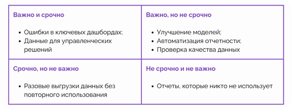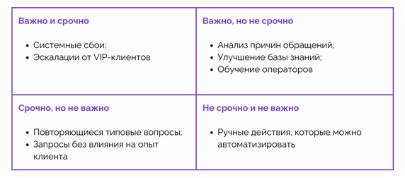 - Добавляйте к срочным задачам бизнес-метрики: конверсия, SLA, выручка, удержание, NPS. Это помогает отделить действительно важные задачи от тех, которые требуют быстрой реакции;