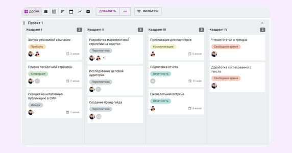 Если команда проще воспринимать задачи в виде карточек, то можно разместить матрицу Эйзенхауэра прямо на канбан-доске. В этом случае каждый квадрант матрицы — отдельная колонка.