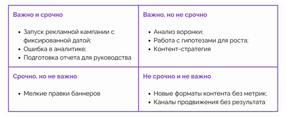- Раз в месяц пересматривайте блок «Не срочно и не важно» и закрывайте или архивируйте задачи без метрик, ответственных и ожидаемого эффекта. Это освобождает ресурс для гипотез, которые действительно могут повлиять на результат.