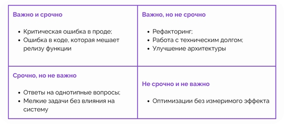 - Для задач из квадранта «Важно, но не срочно» фиксируйте стоимость откладывания. Что именно произойдет, если задачу не сделать сейчас: вырастет техдолг, снизится качество продукта, замедлится рост? Это помогает аргументировать приоритеты перед командой и стейкхолдерами.