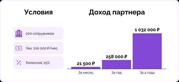 Первый поток — комиссия 15-40% от подписки клиента (зависит от уровня). Kaiten приводит ориентир по экономике на уровне 25%: при подписке клиента 100 000 ₽/мес партнер получает 21 500 ₽/мес (это 258 000 ₽ в год и ~1 032 000 ₽ за 4 года) только на комиссии.